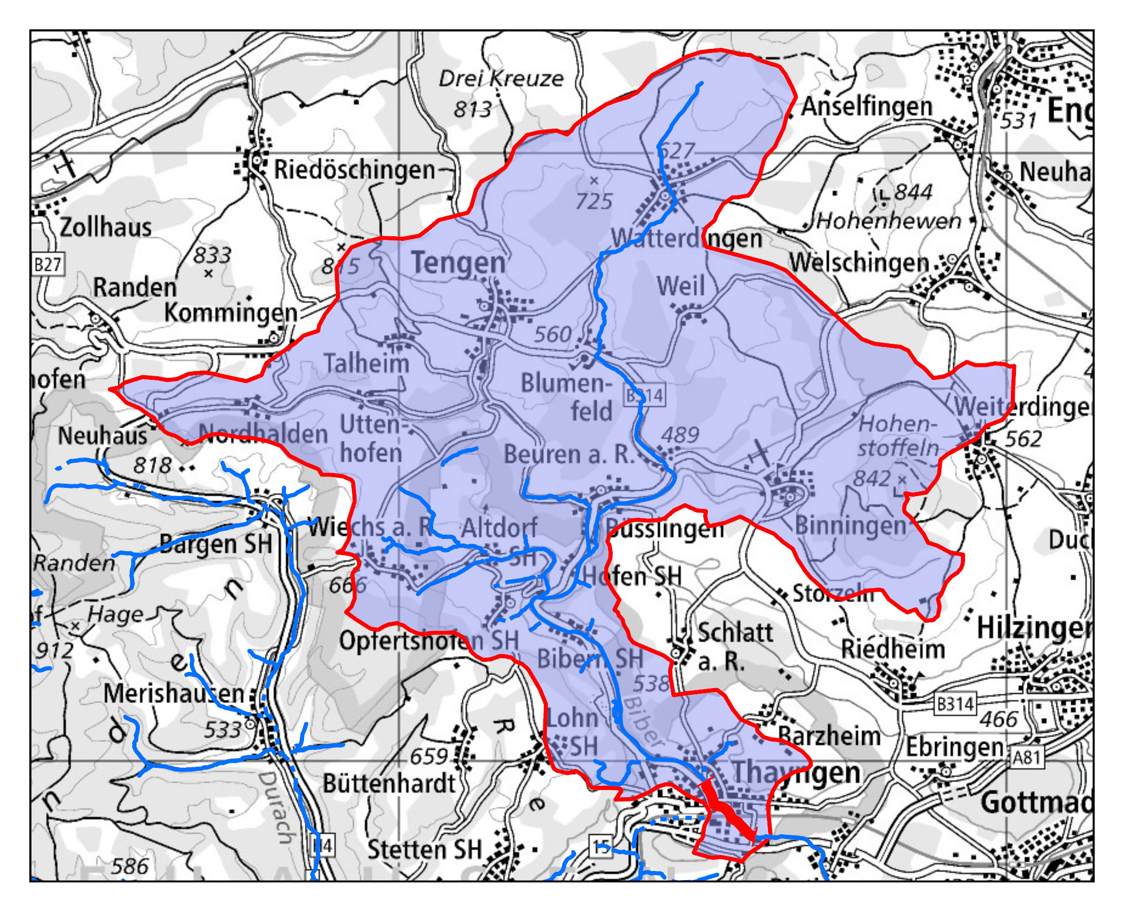 Das für die Biber in Thayngen massgebende Einzugsgebiet (rot umrandet) umfasst rund 80 Quadratkilometer, davon liegt ein Grossteil auf deutschem Staatsgebiet. Die Biber verfügt dort über zahlreiche Seitenbäche, welche bei Starkniederschlägen zu einem schnellen Anschwellen des Hochwasserabflusses beitragen.