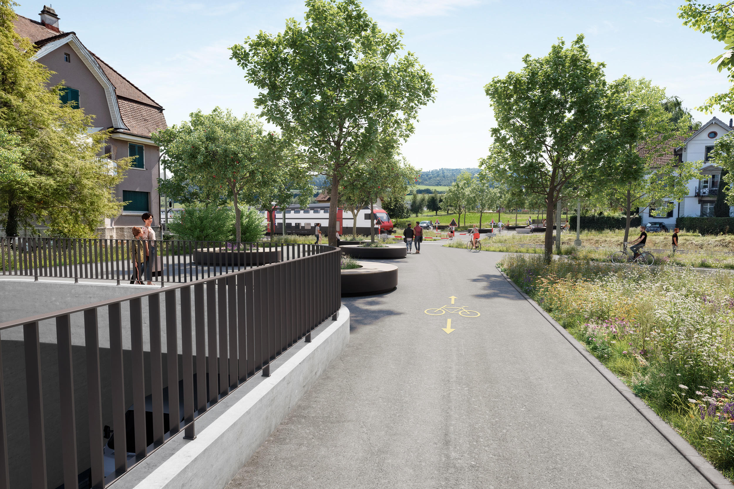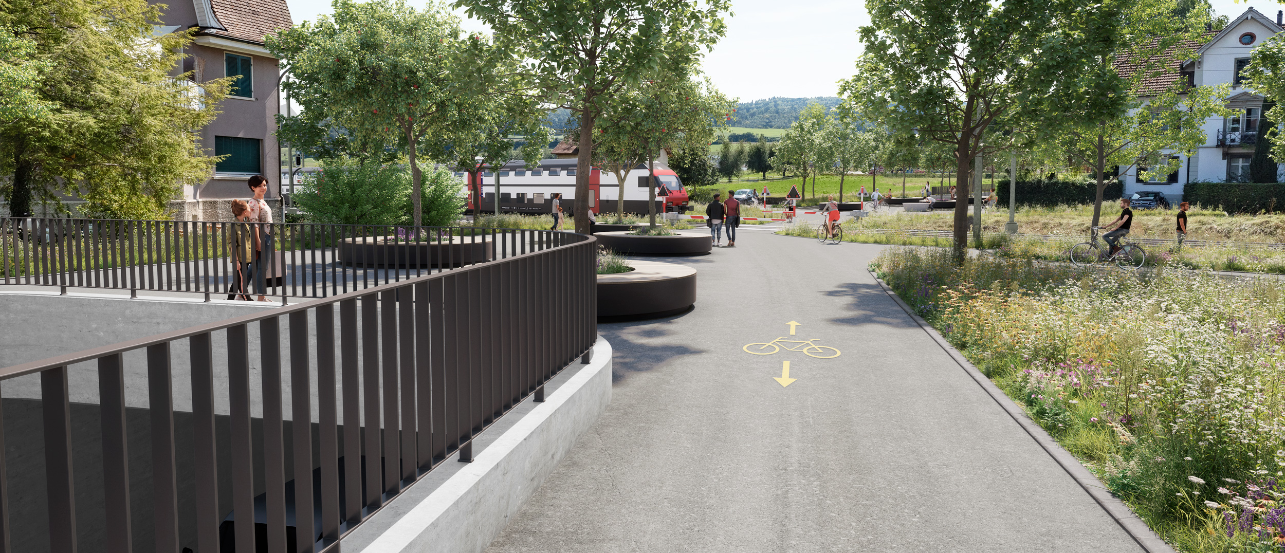 Mit dem Bauprojekte erhalten Fuss- und Veloverkehr klar geführte, breitere Wege. Der Alltagsveloverkehr verläuft entlang der Kaltenbacherstrasse, der Freizeitverkehr über den Bahnhof.
